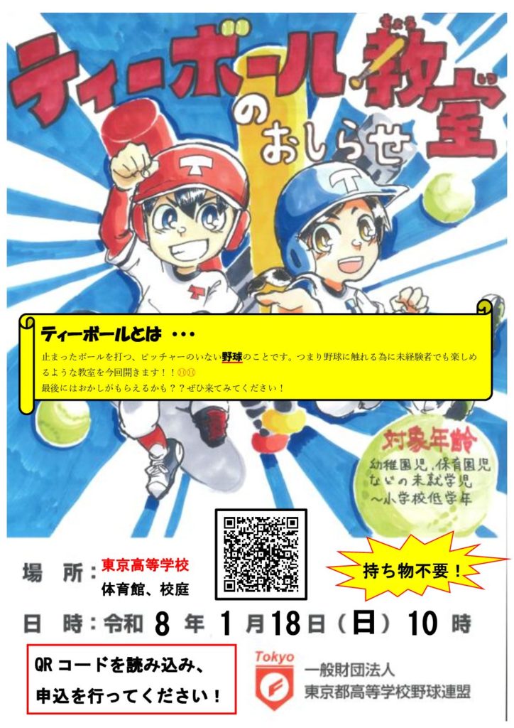 令和8年1月18日(日)10時より、ティーボール教室を実施いたします。